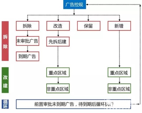 其次是细化、完善管理程序,实现精细化管理。依据广告总规确立的实施路径,完善并细化相关管理程序、明确权责。捋顺两条线:第一是要捋顺政府内部各部门之间关系,建立广告规划实施的协调机制,在户外广告的建设、整改、市场化运营等各个层面分工和协调关系;第二是要捋顺对外的关系,广告审批(备案)、监督、执法、拍卖等各个环节的办事流程、制约机制等。在技术层面,可依托智慧城市管理平台实现户外广告的数字管理,提高管理效力。