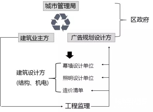 对大多数商业建筑而言,户外广告成为立面主要构图要素,如需有效改善建筑立面则户外广告规划设计至关重要,因此在此类项目中以户外广告设计方进行主导实施建筑立面整体改造将事半功倍。以深圳福田区户外广告一体化规划设计项目为例,项目由福田区城管局牵头对福田重要区域节点进行视觉一体化改造设计,商家业主为提高自身品牌形象申请立面改造,政府对商户提供免费设计服务支持,商户出资金改造。由区政府牵头,主管部门——城市管理局和广告规划设计方、建筑业主方组成项目协调小组,共同检讨设计方案,保证了方案既满足业主商户需求同时也符合府统一规划设计要求。
