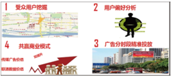“互联网+”新环境下的户外媒体运营模式。通过大数据技术,提供了包括媒体投放选址、人群流量分析、受众消费指数及兴趣偏好等多方面的数据分析服务,解决了提升户外媒体关注度、合理的定价模式、科学设置轮播时长、创新户外媒体视频播放形式等一系列问题;同时,向广告投放人提供的受众最大化、实现精准营销、广告创意来源、提升转化率、高效资源分配等服务中,提供数据支撑。