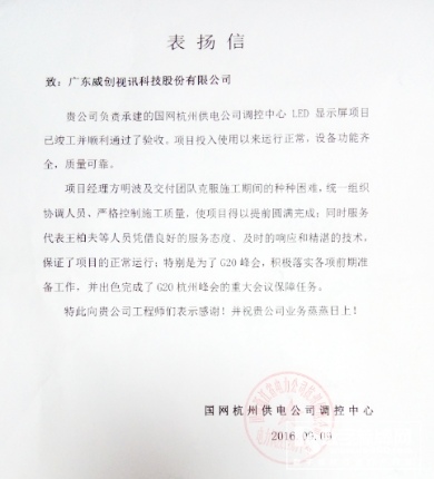 威创多方位护航”G20”峰会。9月4日到5日,二十国集团(G20)领导人第11次峰会在杭州圆满举行。峰会期间,威创向杭州多个重要机构提供了产品及服务,多方位护航峰会,产品与服务经受了严格考验:服务杭州公安,顺利实现安保指挥“可视可控”;服务杭州交通,立体保障航空、地铁、公路顺畅运行;服务阿里巴巴,让参观的各国元首真切体验多场景的“可视化”;服务杭州电力,9月9日收到用户热情洋溢的表扬信。