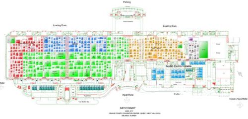 2017年InfoComm美国展于6月14日在美国奥兰多奥兰治县会议中心开幕。本展会汇聚了应用在教育及培训、交通、安防、医疗、娱乐、建筑、企业和政府部门等领域的视听技术、解决方案。展馆分为增强虚拟现实技术(绿色区)、音频(黄色区)、照明&舞台(紫色区)、数字标牌(红色区)、UCC(深蓝区)五大展区,浅蓝色为音频效果体验区。