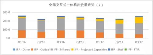 由于激烈的市场竞争,许多品牌都在积极下调电容式交互一体机价格,其出货量在2017年第三季度已经达到了所有交互式一体机的27.2%。可以预见未来几个季度该产品的出货量会进一步的增加。大多数一线品牌正在倾向于放弃表面声波技术,原因是其易受环境因素中,灰尘,水,昆虫等影响。