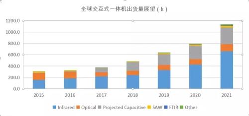 IHS Markit数据显示,交互式一体机产品在经过2017年的一个稳定过度之后,2018年开始会有一个快速的增长。IHS Markit预计,交互式一体机产品在2018年将会超过50万台,而从2018年到2021年年度复合成长率(GAGR)将会保持在44%以上。其中,传统红外触控仍将保持领先优势,电容和光学紧随其后。